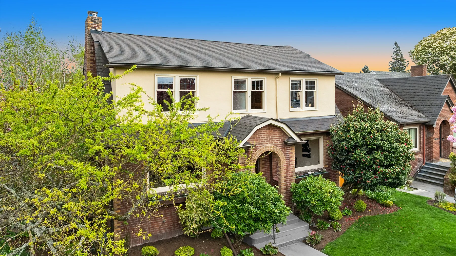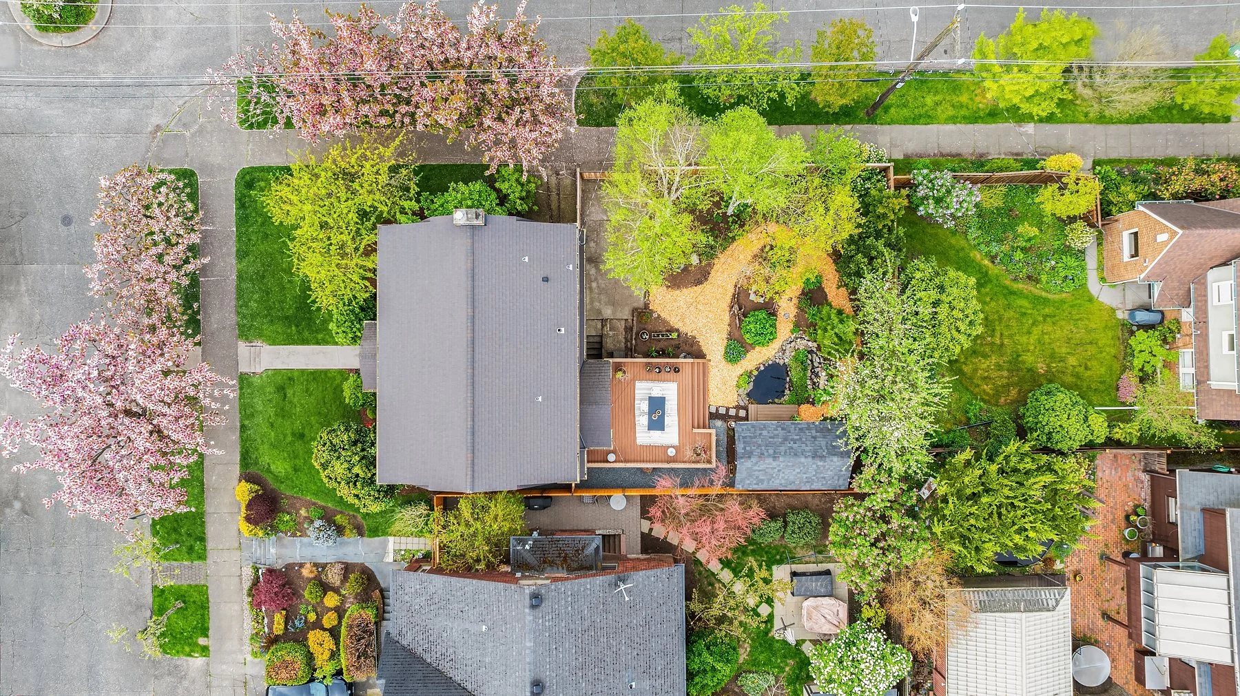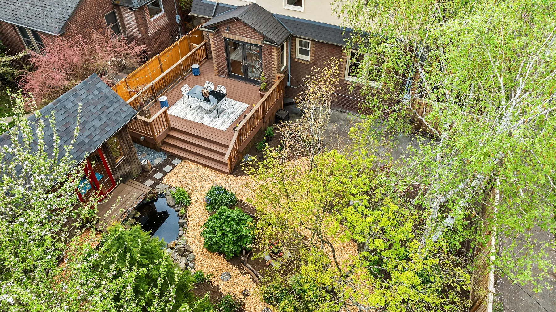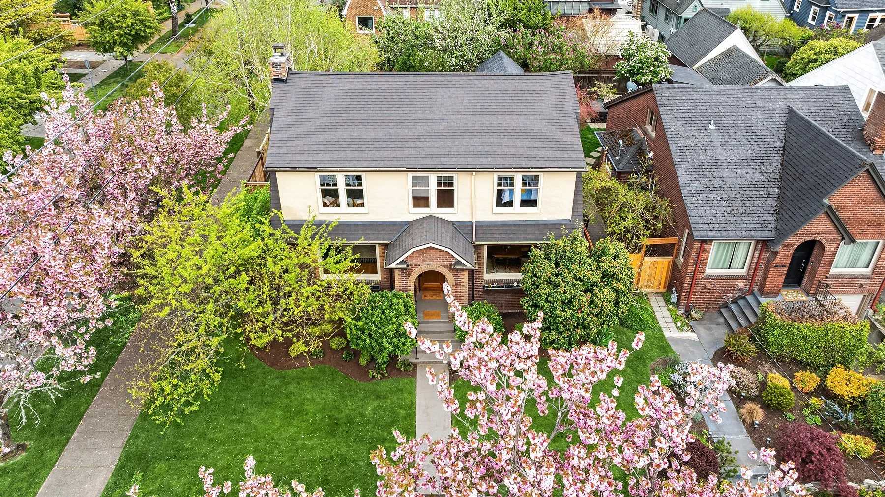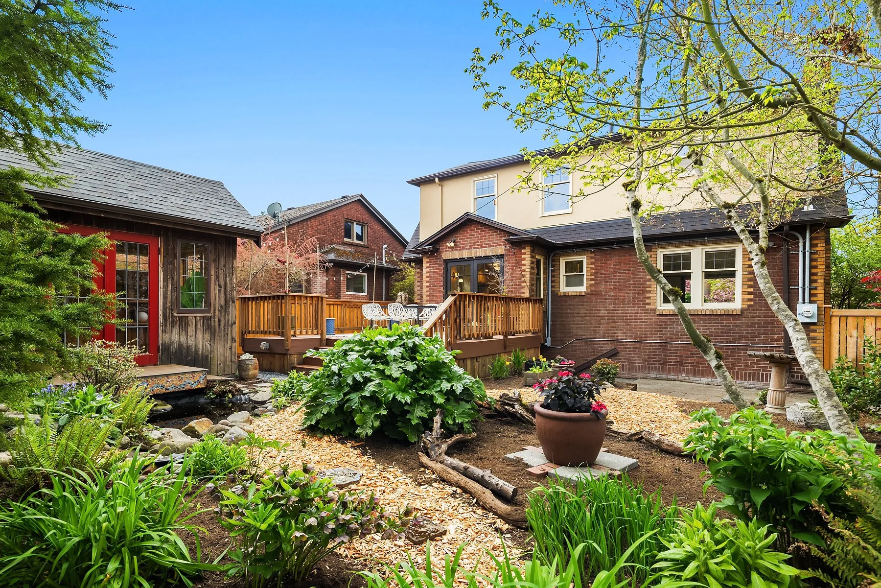 Behold Ravenna’s crown jewel—an exceptional gem w/ storybook curb appeal & a magnetic presence that draws you in. Inside, bright & beautifully curated, sun-drenched living & dining rooms—straight out of Elle Decor—set the tone w/ coved ceilings, rich mahogany millwork & beautifully refinished hardwoods. The sleek, designer kitchen features a sunny breakfast nook, while French doors open wide to an expansive entertaining deck & the magical gardens. Upstairs, three bright & serene bedrooms—including an expansive, sunlit primary—are framed by dreamy cherry blossom outlooks. The lower level offers flexible media, guest, or office space, along w/ laundry, generous storage & a perfect workshop. Updated w/ central AC & off-street parking for everyday ease. The grounds are the heart—the undeniable showstopper. Lush, layered & full of wow factor, w/ gardens, birdbaths & winding paths that create a true in-city sanctuary. Seamless indoor-outdoor living unfolds w/ ease, where days flow outside & evenings glow beneath string lights. A charming detached studio is the cherry on top! Set proudly on a sunny corner lot in one of Ravenna’s most coveted pockets, just moments to cafés, light rail & neighborhood favorites—lovingly treasured by only three families over the past 100 years! This is the one. Updated. Magical. Happy. A true WOW at every turn—w/ the best energy the moment you arrive.